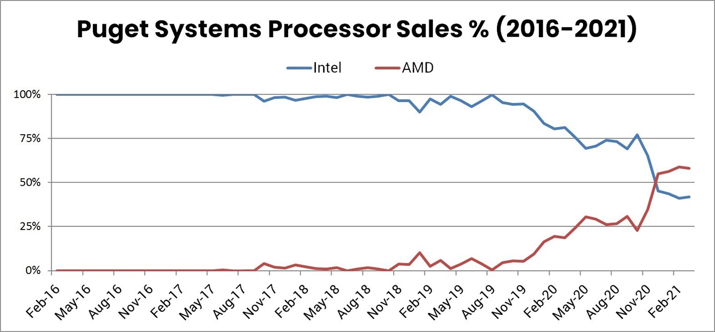 在 2017 年 8 月以前,Puget Systems 几乎没有任何 AMD 电脑的订单。而随着 AMD Ryzen 锐龙一代的发布,该平台选择 AMD 处理器的用户渐渐多了起来。到了 2020 年 11 月,选择 AMD 处理器的用户数量首次超过了英特尔。