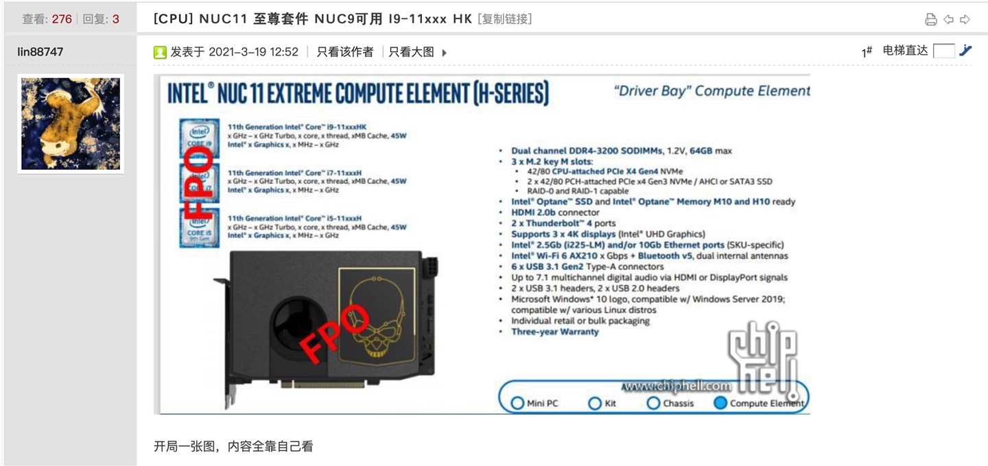 根据 ChipHell 论坛的消息,幽灵峡谷 NUC 的新款计算卡曝光了,搭载了即将发布的 11 代酷睿标压 H 系列处理器。