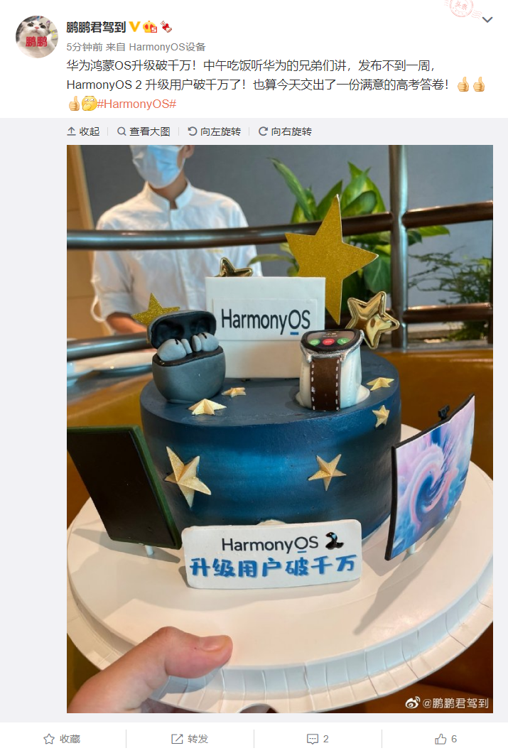 据微博博主 @鹏鹏君驾到 消息,听华为的人士讲,发布不到一周,HarmonyOS 2 升级用户破千万了,也算今天交出了一份满意的高考答卷!
