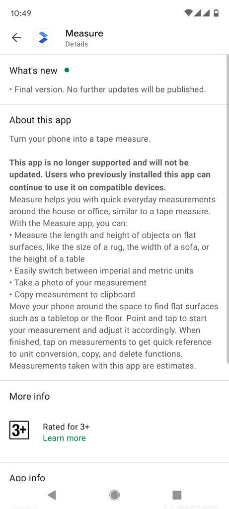 6 月 10 日消息 谷歌近日在 Google Play 下架了官方 AR 测量 App Measure,该 App 可使用手机摄像头对现实中的物体测量长度。