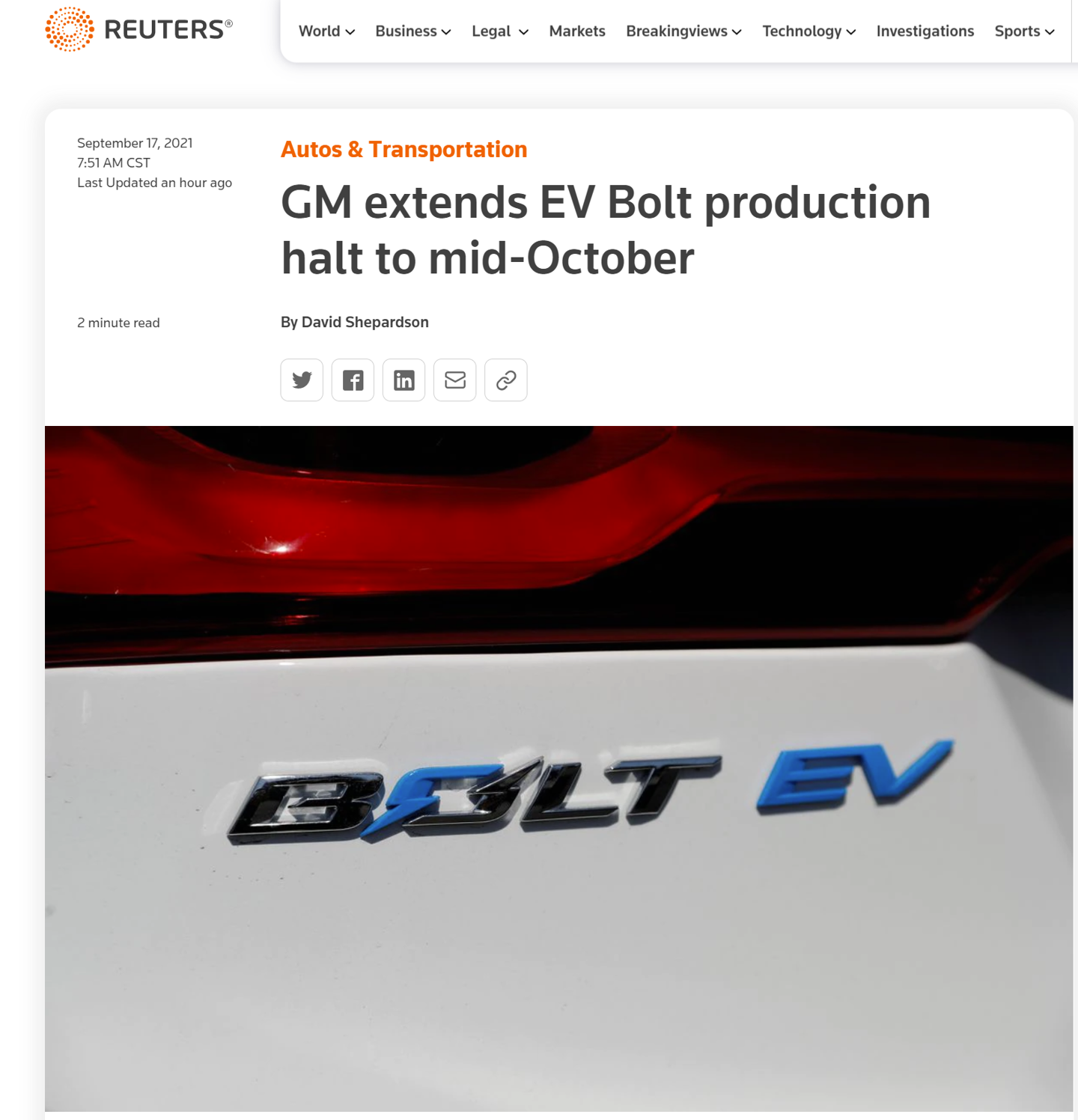 通用汽车将 Bolt EV 停产时间延长至 10 月中旬