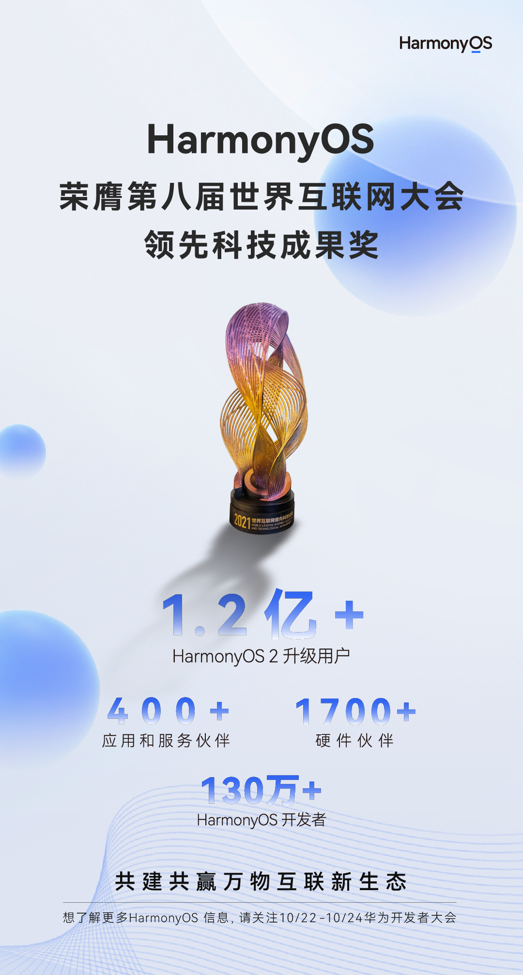 据 HarmonyOS 官方微博,HarmonyOS 凭借在互联网产业创新方面发挥的积极作用,在 2021 年世界互联网大会上获得“领先科技成果奖”。