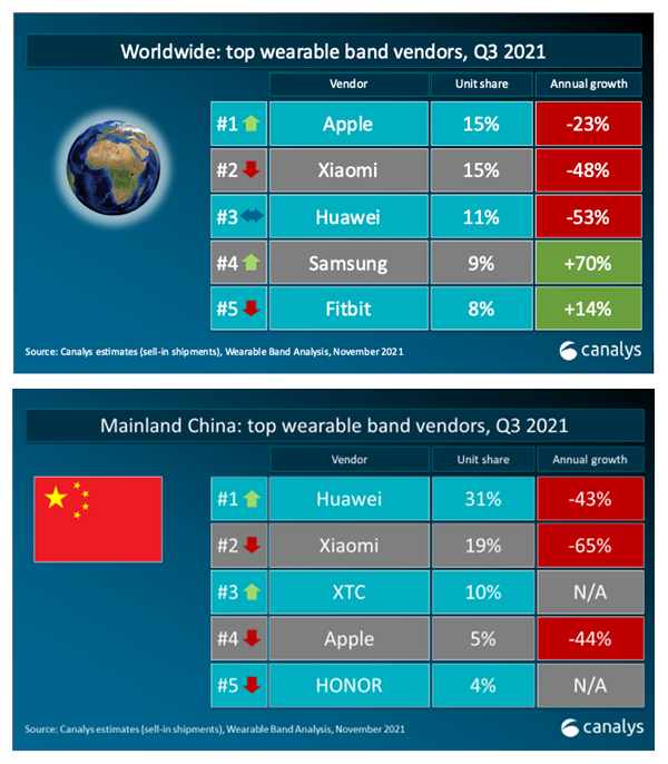 11 月 26 日消息,今日,Canalys 发布报告称,2021 年第三季度,全球可穿戴腕带设备出货量达到 4782 万台,同比下降 11 %。
