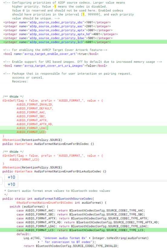在代码中还可以看到,AAC、SBC、aptX、LDAC 等音频编码依旧保留。