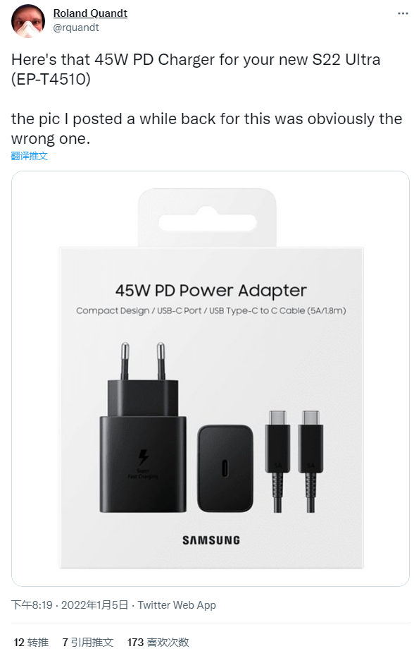 1 月 5 日消息,@Roland Quandt 放出了一份重磅爆料,三星 Galaxy S22 Ultra 将采用新款 45W 充电器 EP-T4510(不确定是否标配)。