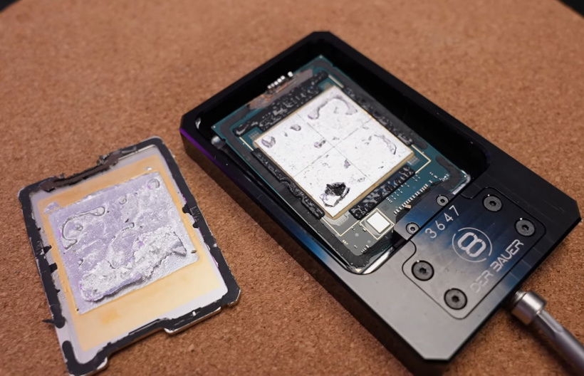 这名玩家使用加热台对处理器升温,目的是融化内部的钎焊金属。开盖之后,可以看到内部巨大的四颗芯片紧凑排列在一起。