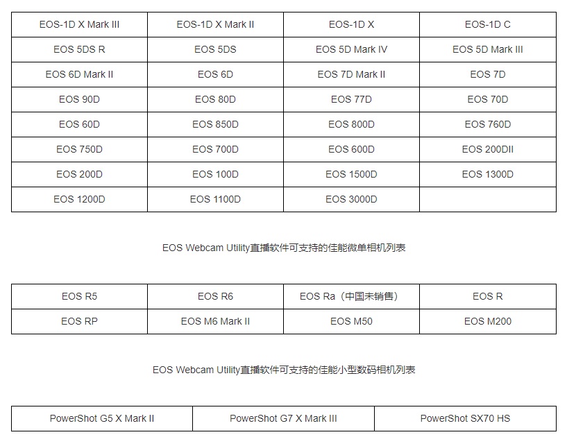 目前佳能的直播软件已经支持 42 款相机,列表如下: