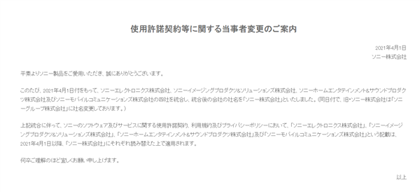 该声明指出,索尼电子公司,索尼影像产品和解决方案公司,索尼家庭娱乐和音频产品公司以及索尼移动通信公司将合并成“索尼公司”,同日,“索尼公司”正式更名为“索尼集团公司”