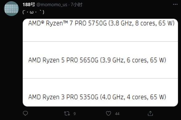 AMD Ryzen 7 PRO 5750G 是一个 8 核型号,基础频率为 3.8 GHz,Ryzen 5 PRO 5650G 的 6 核型号可能拥有 3.9 GHz 的基本频率,而四核的 Ryzen 3 PRO 5350G 基础频率为 4.0 GHz,这三个型号均是基于与 AM4 插槽兼容的塞尚代处理器。