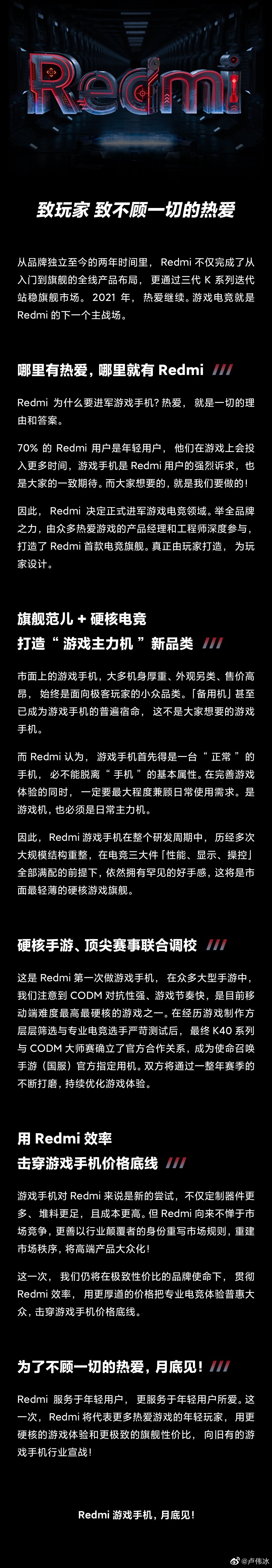 Redmi 今日正式官宣,决定进军「游戏手机」,旗下首款大作将于月底发布。现在小米集团合伙人高级副总裁 中国区、国际部总裁 Redmi 品牌总经理卢伟冰向用户讲述了 “Redmi 为什么要进入游戏手机战场”这一问题。