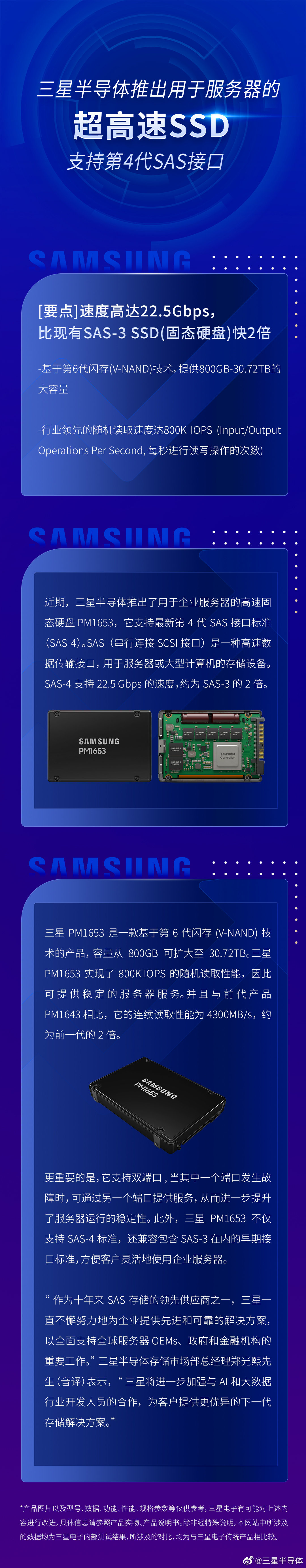4 月 27 日消息 根据三星官方的消息,三星推出超高速 SSD PM1653,支持第 4 代 SAS 接口,能效进一步提升。
