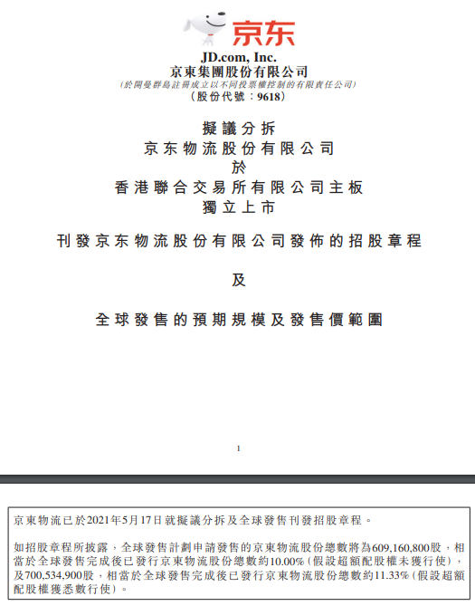 公告指出,如招股章程所披露,全球发售计划申请发售的京东物流股份总数将为 609,160,800 股,相当于全球发售完成后已发行京东物流股份总数约 10.00%(假设超额配股权未获行使),及 700,534,900 股,相当于全球发售完成后已发行京东物流股份总数约 11.33%(假设超额配股权获悉数行使)。