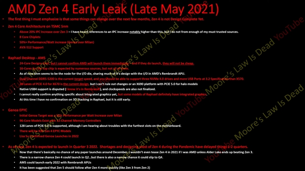 爆料达人Moore's Law is Dead在汇总了一些他获知的Zen4最新情报,简单整理如下: