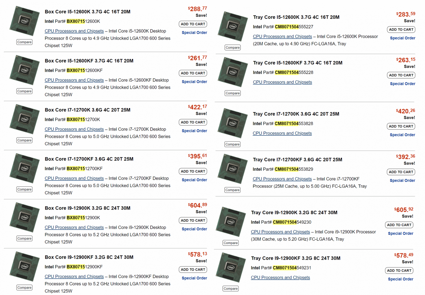 从零售商 Provantage 的商店详情来看,Alder Lake 系列 CPU 有两种版本,似乎就是国内常见的散片以及盒装的区别,不过它们之间的定价似乎没有太大差异,甚至一些散片比盒装更贵。